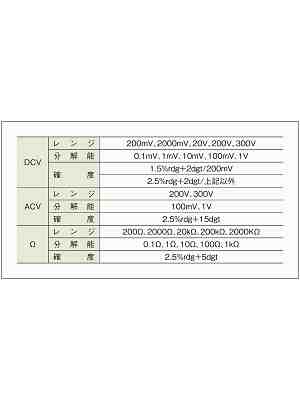 - 测量范围:DC电压/200mV・2000mV・20V・200V・300V、 AC电压/200V・300V、 抵抗/200Ω・2000Ω・20kΩ・200kΩ・2000KΩ